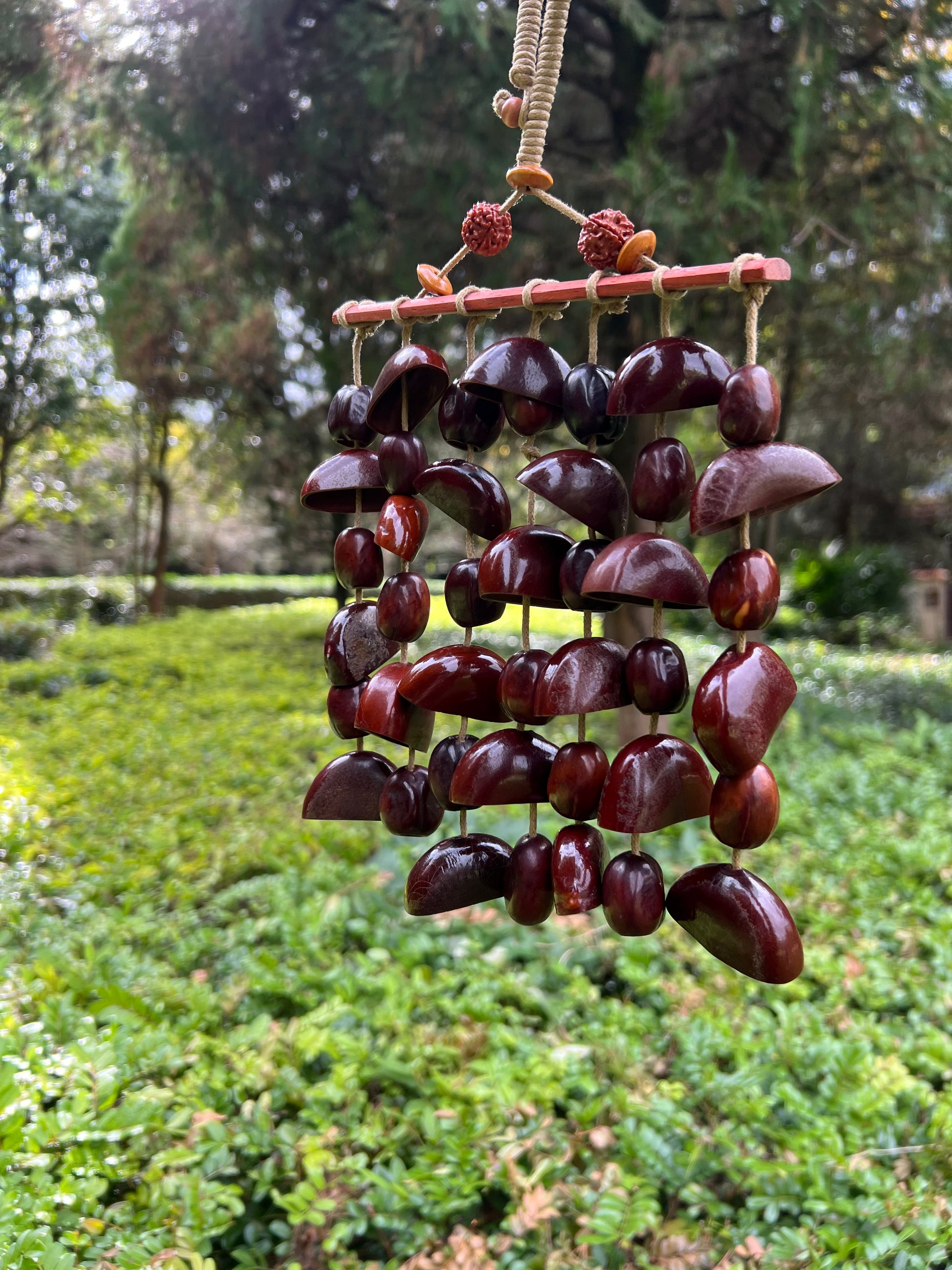 Unlike the sharp, piercing ring of metal wind chimes, these hollow nut shells create a deep, earthy rustle. When you run your hand through them or let the breeze catch them, they mimic the sound of a flowing stream or gentle rain falling on dry leaves.